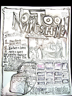 We're standing in front of the “slab shed”, cobbled together from aluminum sheets from a letterpress shop, wood off-cuts and rounds that a sawmill would otherwise burn or grind into sawdust, and the front door that formerly graced a friend's house.